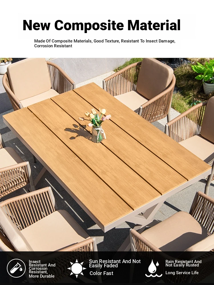 Aluminum Alloy and Plastic Wood Outdoor Dining Set - Stylish Garden Patio Furniture with Rattan Chairs for Relaxation and Entertaining in Your Villa or Backyard. Perfect for Alfresco Dining!