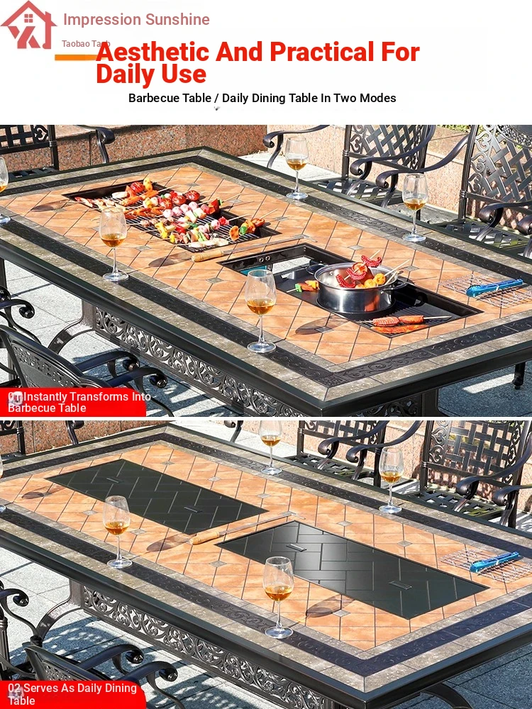 Outdoor BBQ Table and Chairs Set - Chinese Style Patio Grilling Table for Leisure Courtyard - Perfect for Home Use with Electric and Charcoal Grilling, Durable Tile Surface