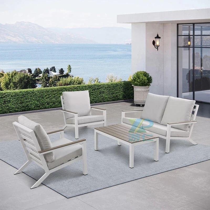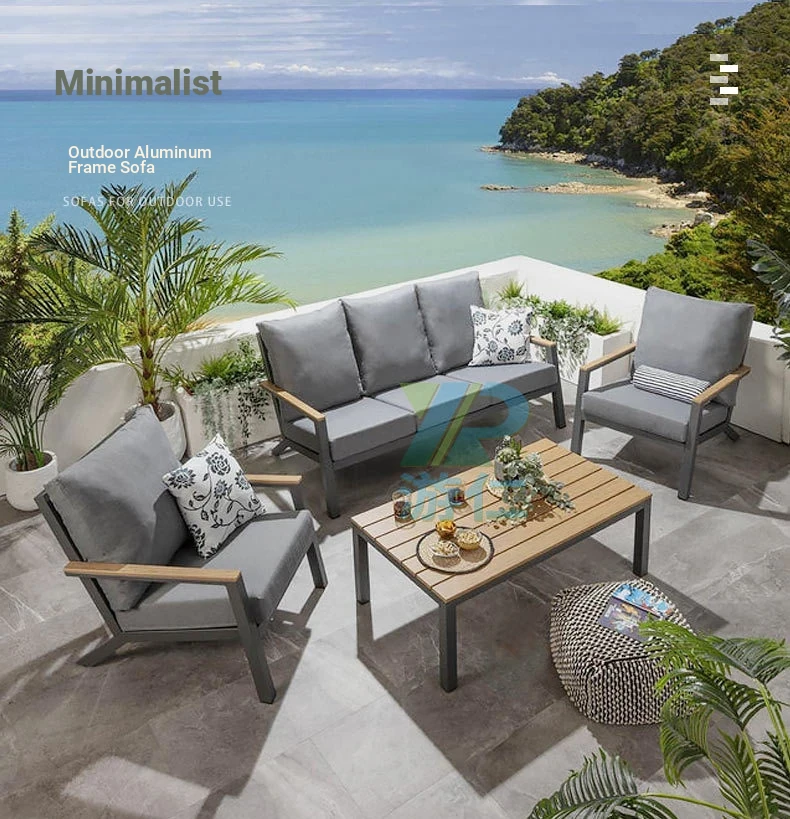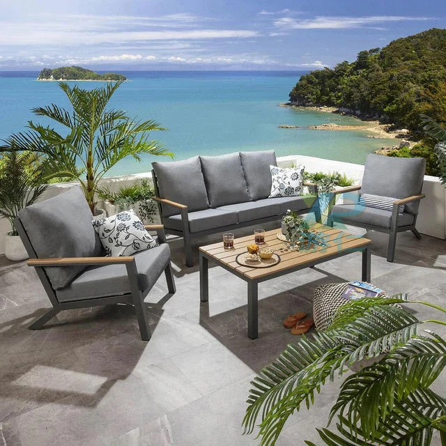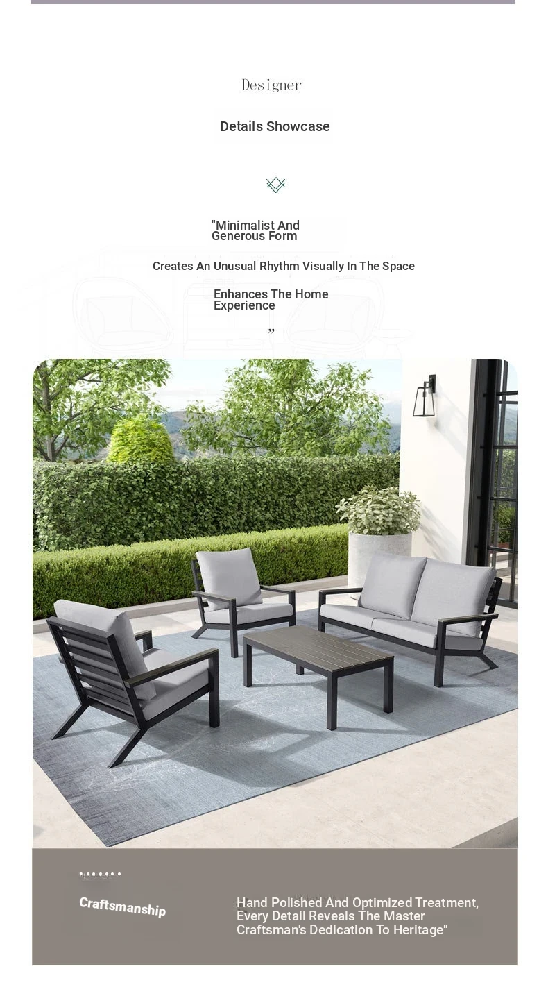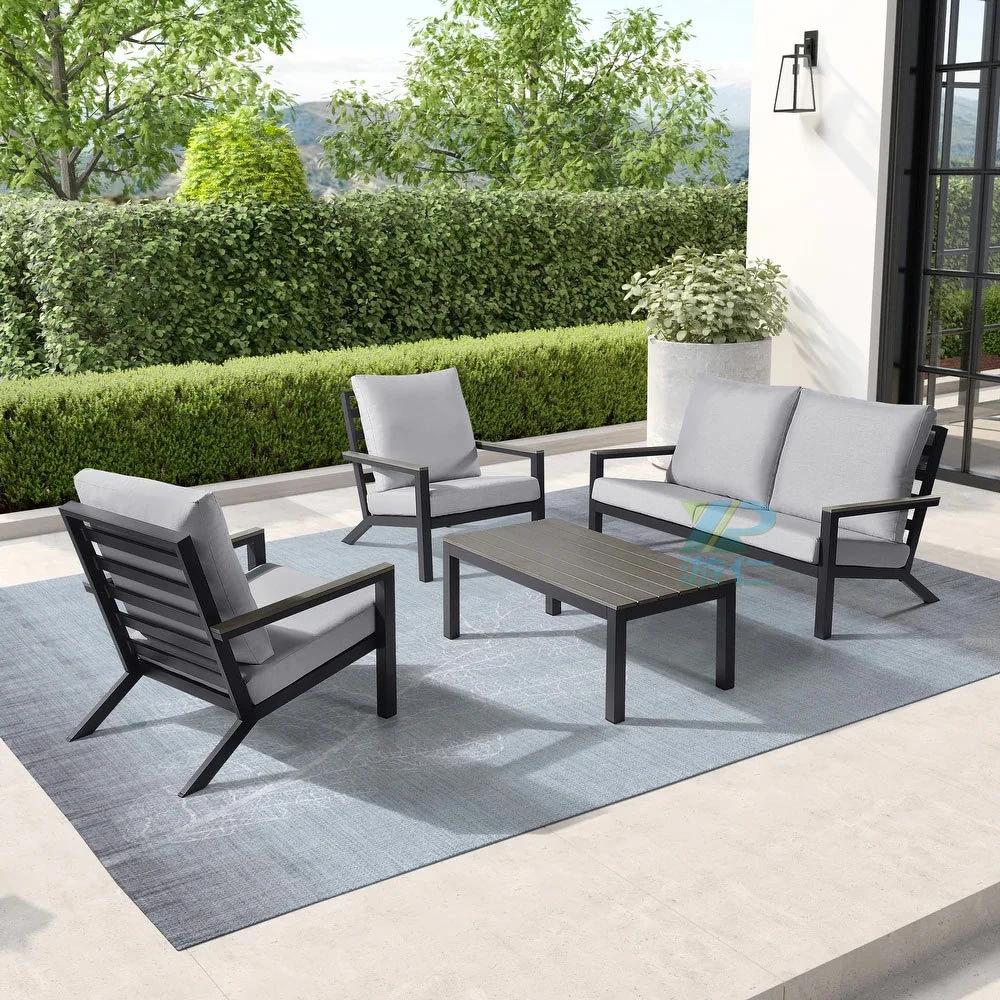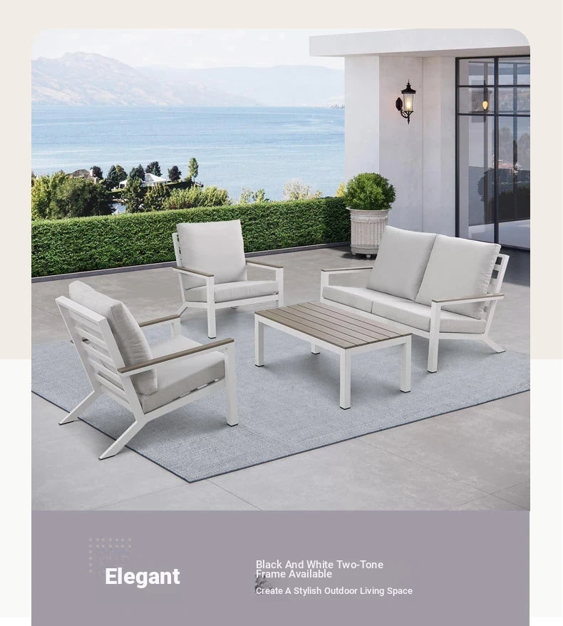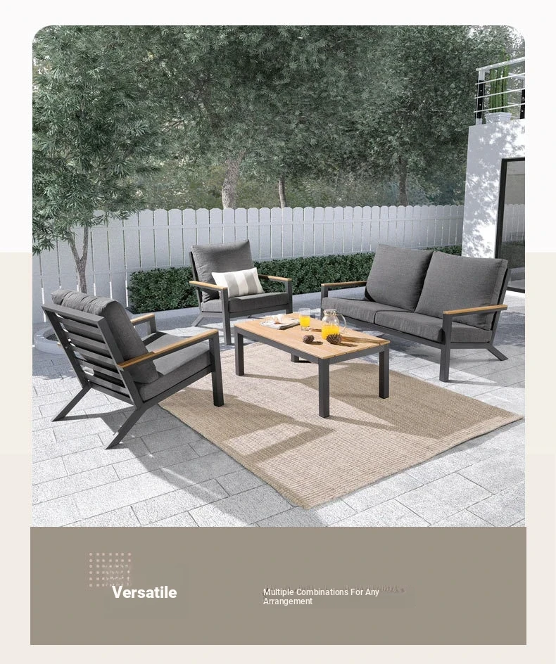 Outdoor Aluminum Sand Color Sofa Set for Villa Gardens – Weatherproof & UV Resistant Chairs with Durable Plastic Wood Coffee Table, Ideal for Patios and Sales Lounges